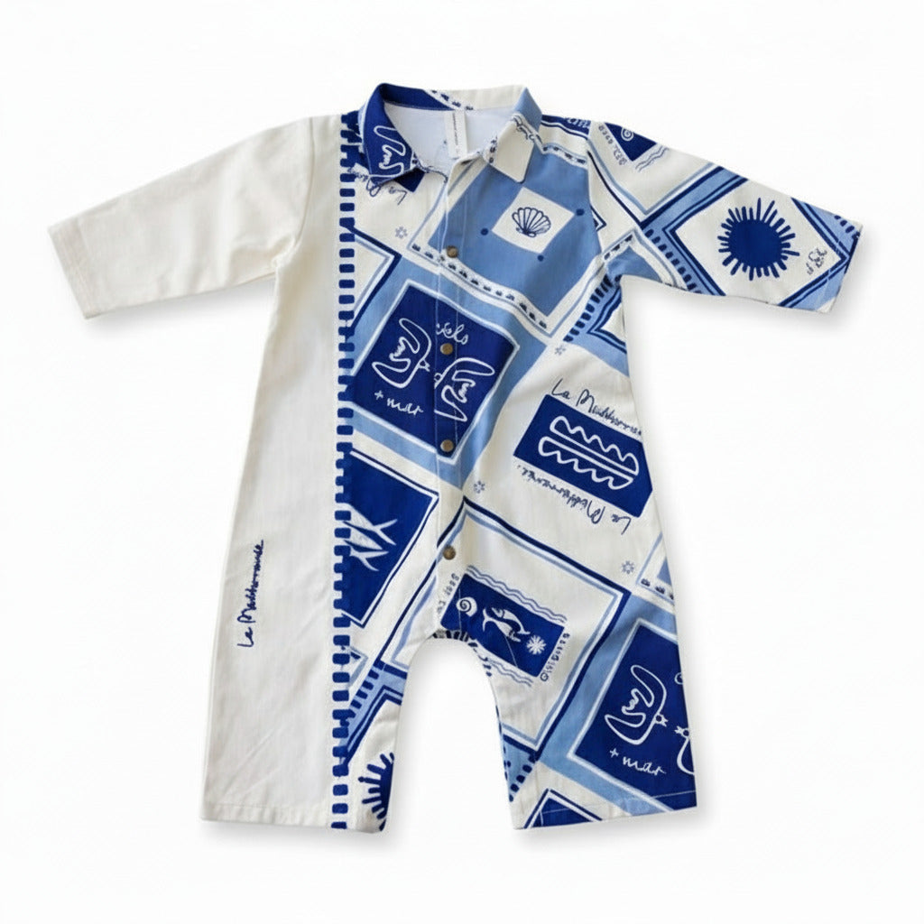 Made from light, breathable french cotton terry, this fun sleeveless romper was inspired by the mediterranean summer seaside.